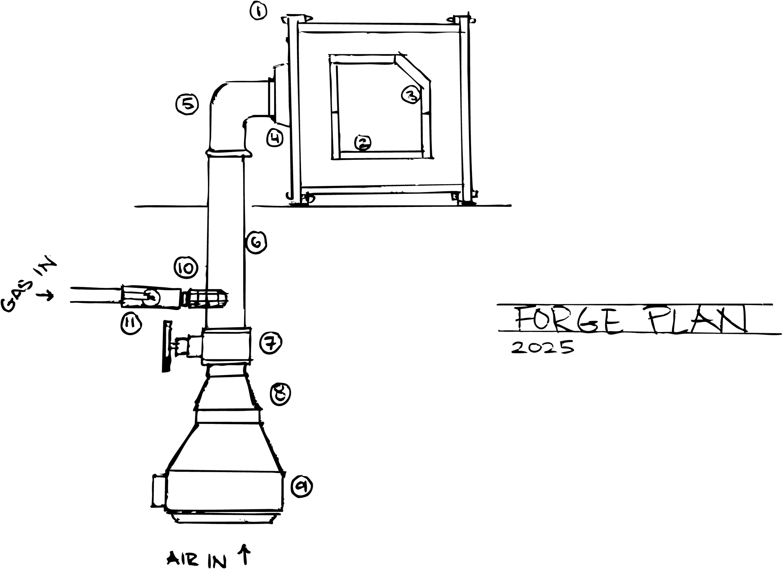 The specific features that make this design unique for my needs are: a slim heating chamber to contain heat and preserve energy for forging smaller objects, a curved corner to efficiently circulate heat to the floor of the forge, fixtures and hoses with large ports and diameters to allow low pressure (sub 2 psi) natural gas to maintain a high flow rate, built in arms to hold longer stock, and a bolted frame that’s easy to take apart and repair. There are a few finicky details that I haven’t laid out here, so please reach out to me if you’re building your own and have any questions! The files are to scale and all fit together snuggly with the supplied firebrick. I got them laser cut with SendCutSend out of .188” mild steel. I tried as much as possible to not source hardware from antichrist Bezos, but I’m not perfect.